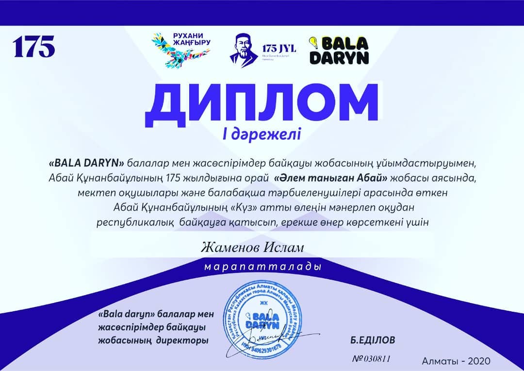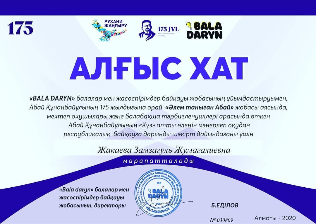 Абай Құнанбайұлының 175 жылдығы қарсаңында «Әлем таныған Абай» «BALA DARYN» жасөспірімдер байқауы жобасы аясында,