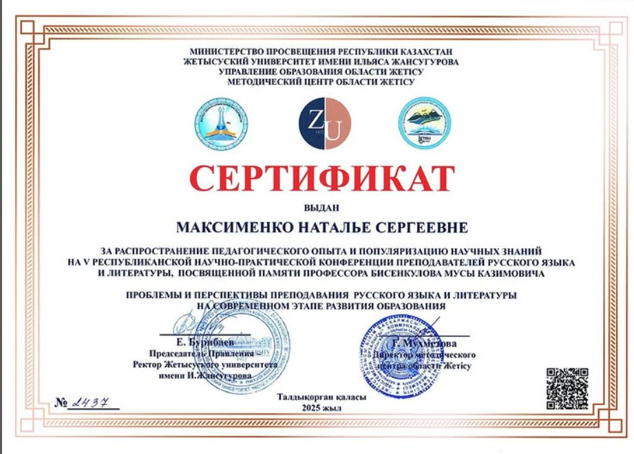 Абай атындағы мектеп-гимназиясының орыс тілі мен әдебиеті пәнінің мұғалімі Максименко Наталья Сергеевна профессор Муса Казимович Бисенқұловтың құрметіне арналған «Қазіргі білім беру кезеңіндегі орыс тілі мен әдебиетін оқытудың өзекті мәселелері мен болашағы» тақырыбындағы республикалық ғылыми-тәжірибелік конференцияға қатысып, педагогикалық тәжірибесін таратқаны және ғылыми білімді насихаттағаны үшін сертификатпен марапатталды.